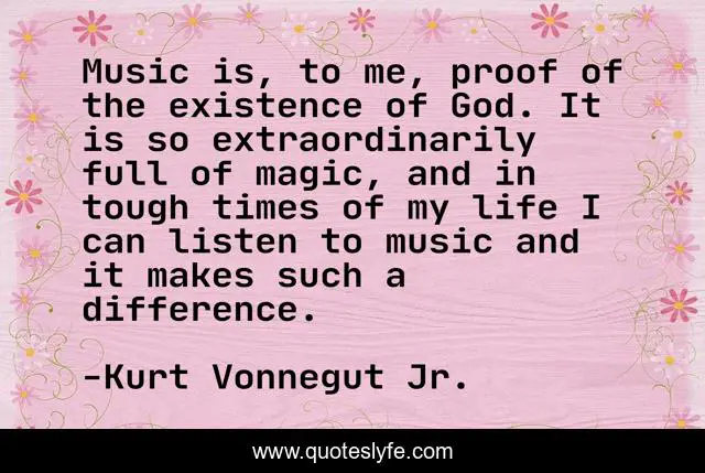This page presents the quote "Music is, to me, proof of the existence of God. It is so extraordinarily full of magic, and in tough times of my life I can listen to music and it makes such a difference.". Author of this quote is Kurt Vonnegut Jr.. This quote is about god, life, music,.