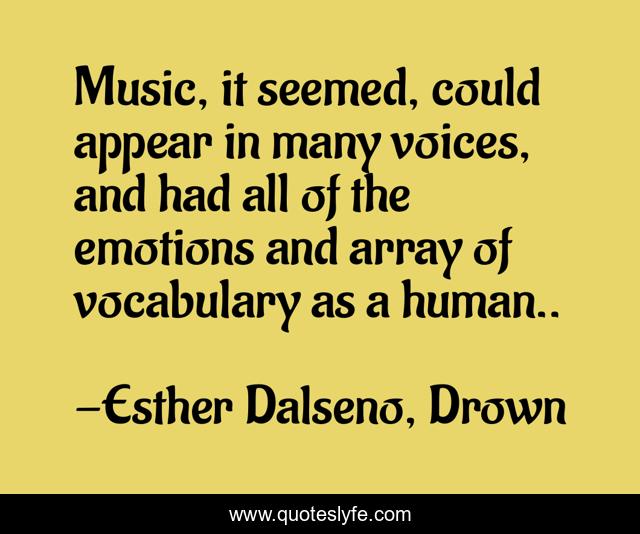 This page presents the quote "Music, it seemed, could appear in many voices, and had all of the emotions and array of vocabulary as a human..". Author of this quote is Esther Dalseno, Drown. This quote is about expression, voice, music, conveying-emotions,.