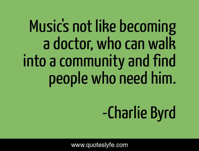 This page presents the quote "Music's not like becoming a doctor, who can walk into a community and find people who need him.". Author of this quote is Charlie Byrd. This quote is about doctor, community, walk,.