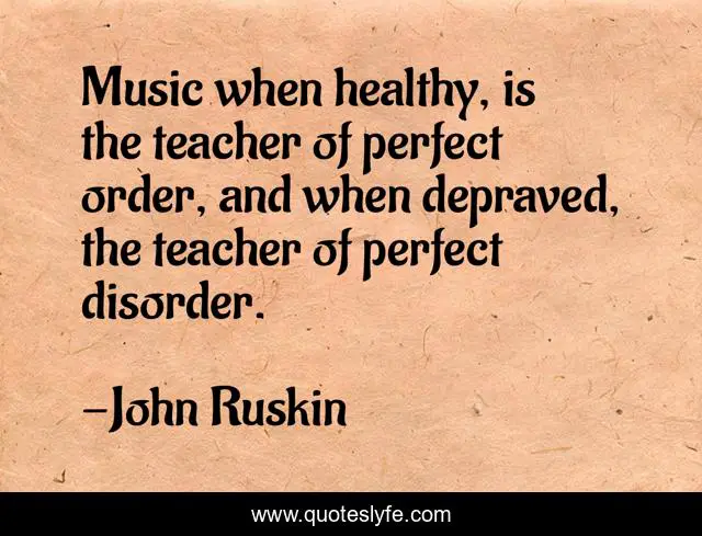 This page presents the quote "Music when healthy, is the teacher of perfect order, and when depraved, the teacher of perfect disorder.". Author of this quote is John Ruskin. This quote is about healthy, perfect, music,.
