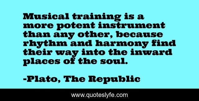 This page presents the quote "Musical training is a more potent instrument than any other, because rhythm and harmony find their way into the inward places of the soul.". Author of this quote is Plato, The Republic. This quote is about philosophy, music,.