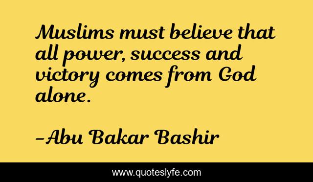 This page presents the quote "Muslims must believe that all power, success and victory comes from God alone.". Author of this quote is Abu Bakar Bashir. This quote is about alone, god, success,.