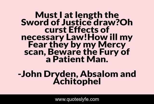 This page presents the quote "Must I at length the Sword of Justice draw?Oh curst Effects of necessary Law!How ill my Fear they by my Mercy scan, Beware the Fury of a Patient Man.". Author of this quote is John Dryden, Absalom and Achitophel. This quote is about fury, patience,.