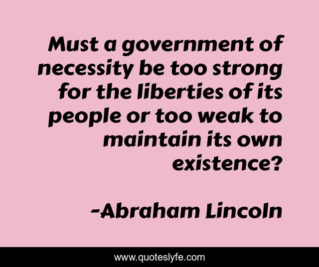 This page presents the quote "Must a government of necessity be too strong for the liberties of its people or too weak to maintain its own existence?". Author of this quote is Abraham Lincoln. This quote is about rule, government,.