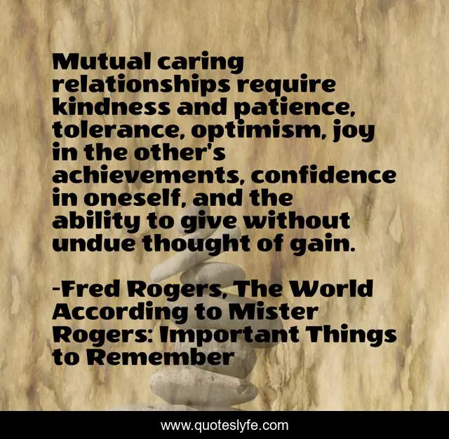 This page presents the quote "Mutual caring relationships require kindness and patience, tolerance, optimism, joy in the other's achievements, confidence in oneself, and the ability to give without undue thought of gain.". Author of this quote is Fred Rogers, The World According to Mister Rogers: Important Things to Remember. This quote is about relationships, enthusiasm, inspirational,.