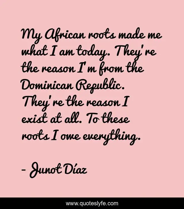 This page presents the quote "My African roots made me what I am today. They’re the reason I’m from the Dominican Republic. They’re the reason I exist at all. To these roots I owe everything.". Author of this quote is Junot Díaz. This quote is about caribbean, dominican, africa, republic, black, latino, afro,.