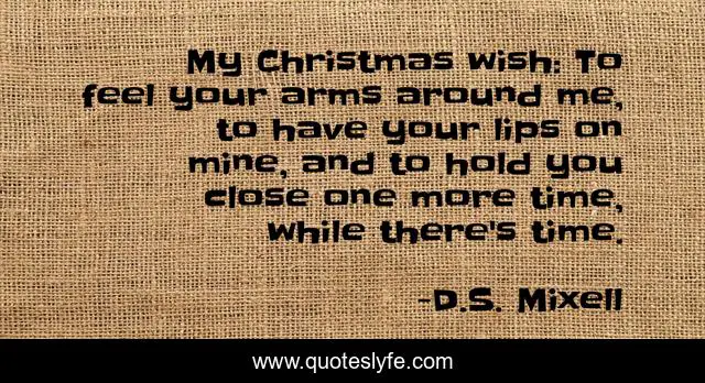 This page presents the quote "My Christmas wish: To feel your arms around me, to have your lips on mine, and to hold you close one more time, while there's time.". Author of this quote is D.S. Mixell. This quote is about love, wish, hugs, feelings, romance, kiss, time, close, hold,.