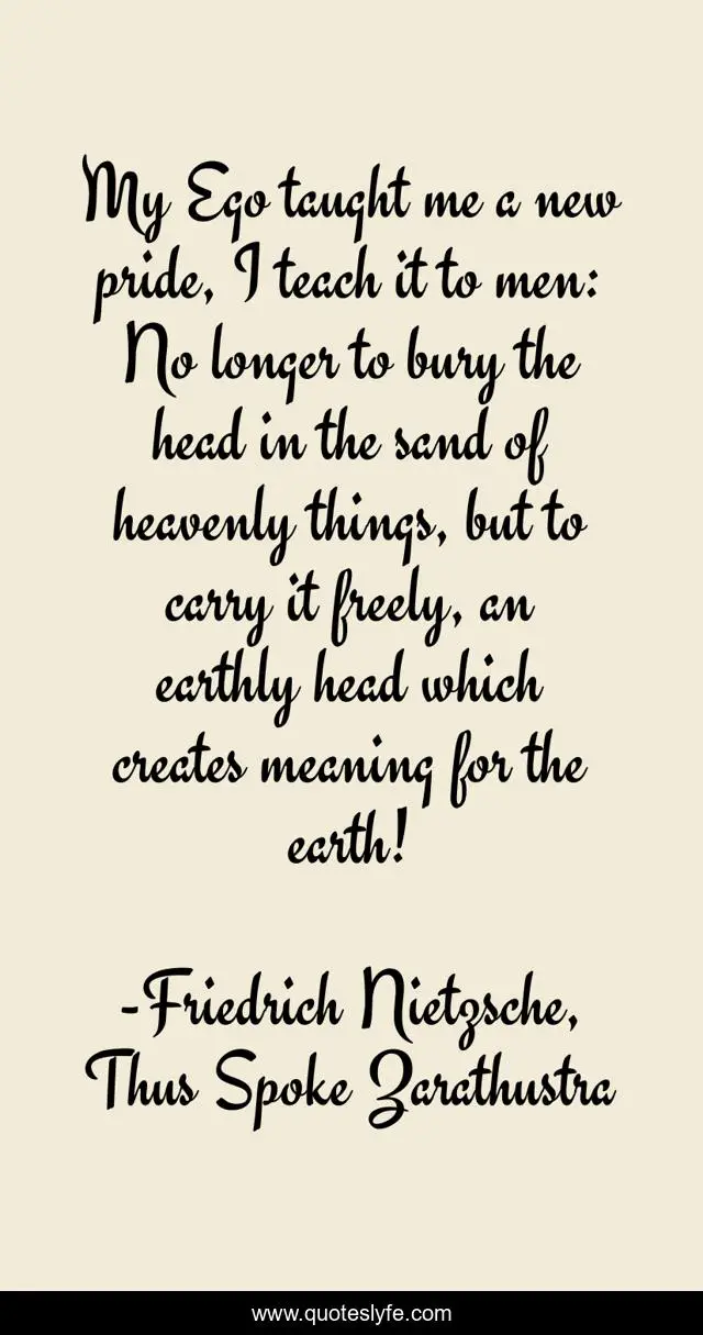 This page presents the quote "My Ego taught me a new pride, I teach it to men: No longer to bury the head in the sand of heavenly things, but to carry it freely, an earthly head which creates meaning for the earth!". Author of this quote is Friedrich Nietzsche, Thus Spoke Zarathustra. This quote is about earth, meaning, pride, ego,.
