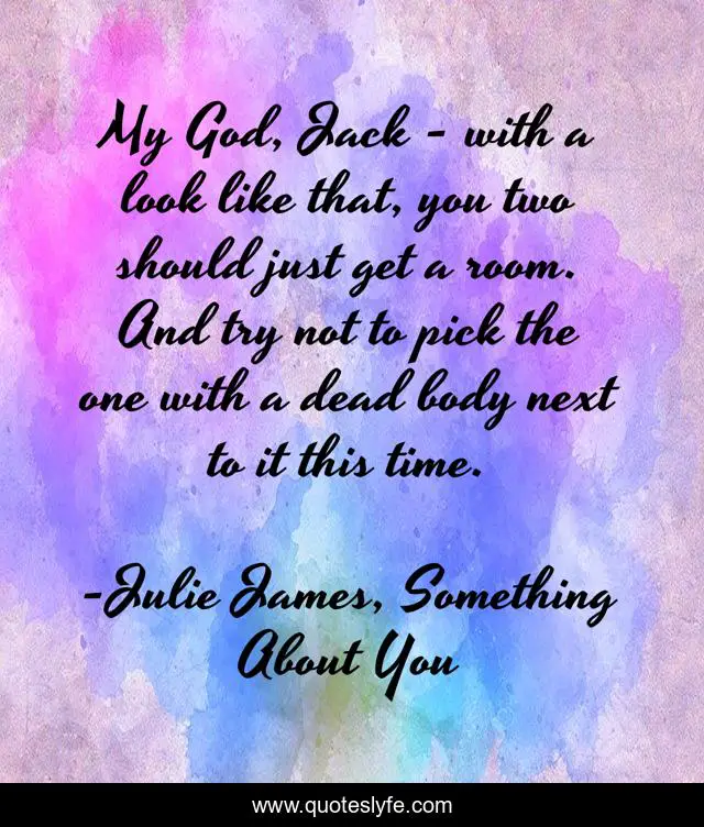 This page presents the quote "My God, Jack - with a look like that, you two should just get a room. And try not to pick the one with a dead body next to it this time.". Author of this quote is Julie James, Something About You. This quote is about romance, something-about-you, humor, julie-james,.