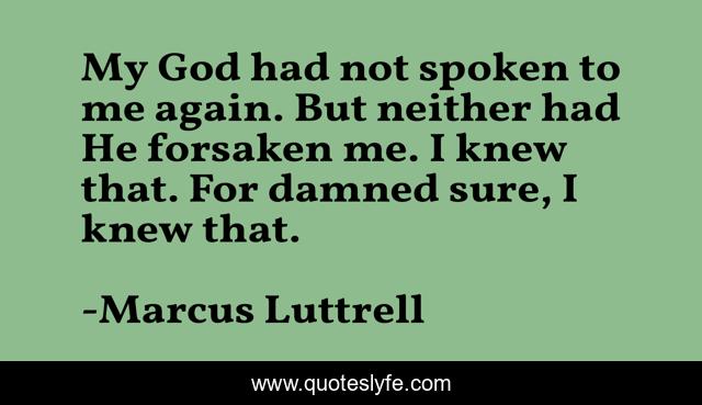 This page presents the quote "My God had not spoken to me again. But neither had He forsaken me. I knew that. For damned sure, I knew that.". Author of this quote is Marcus Luttrell. This quote is about war, navy-seal,.