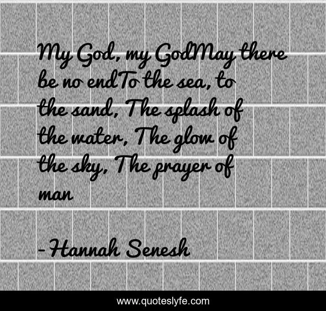 This page presents the quote "My God, my GodMay there be no endTo the sea, to the sand, The splash of the water, The glow of the sky, The prayer of man". Author of this quote is Hannah Senesh. This quote is about earth, inspiration, nature-s-beauty, spirituality,.