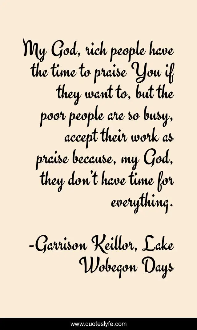 This page presents the quote "My God, rich people have the time to praise You if they want to, but the poor people are so busy, accept their work as praise because, my God, they don’t have time for everything.". Author of this quote is Garrison Keillor, Lake Wobegon Days. This quote is about poor, god,.