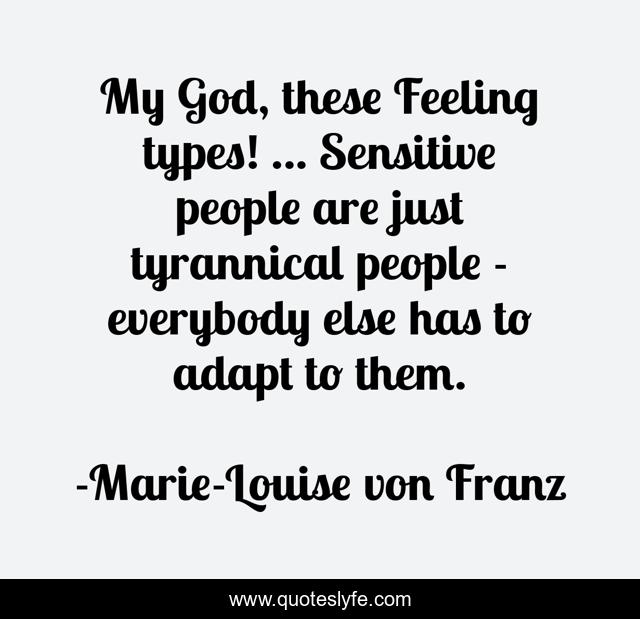 This page presents the quote "My God, these Feeling types! ... Sensitive people are just tyrannical people - everybody else has to adapt to them.". Author of this quote is Marie-Louise von Franz. This quote is about thinking, sensitive, feeling, psychology,.