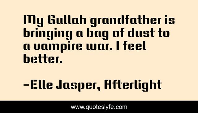 This page presents the quote "My Gullah grandfather is bringing a bag of dust to a vampire war. I feel better.". Author of this quote is Elle Jasper, Afterlight. This quote is about dust, humor, vampire, war,.