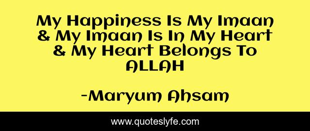 This page presents the quote "My Happiness Is My Imaan & My Imaan Is In My Heart & My Heart Belongs To ALLAH". Author of this quote is Maryum Ahsam. This quote is about spirituality, happiness,.