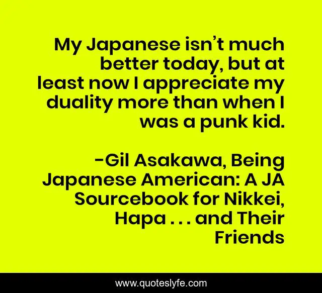 "Gil Asakawa, Being Japanese American: A JA Sourcebook for Nikkei, Hapa . . . and Their Friends Quotes." Quoteslyfe.com, 2025. Mon. 08 Dec. 2025. <https://www.quoteslyfe.com/quote/My-Japanese-isn-t-much-better-today-159404>.