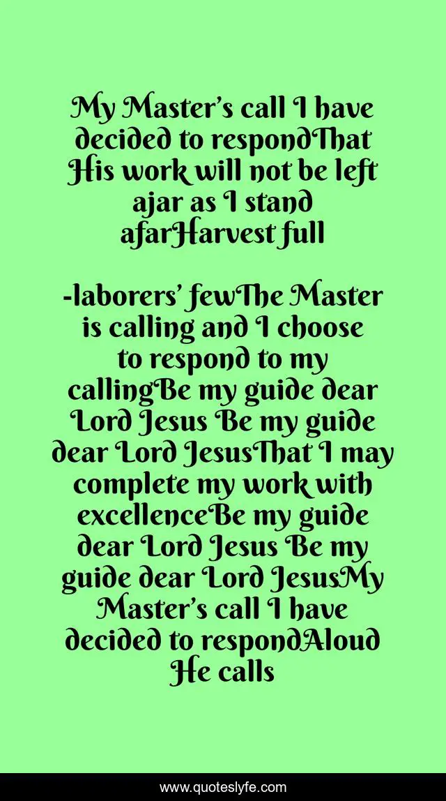 This page presents the quote "My Master’s call I have decided to respondThat His work will not be left ajar as I stand afarHarvest full". Author of this quote is laborers’ fewThe Master is calling and I choose to respond to my callingBe my guide dear Lord Jesus Be my guide dear Lord JesusThat I may complete my work with excellenceBe my guide dear Lord Jesus Be my guide dear Lord JesusMy Master’s call I have decided to respondAloud He calls. .