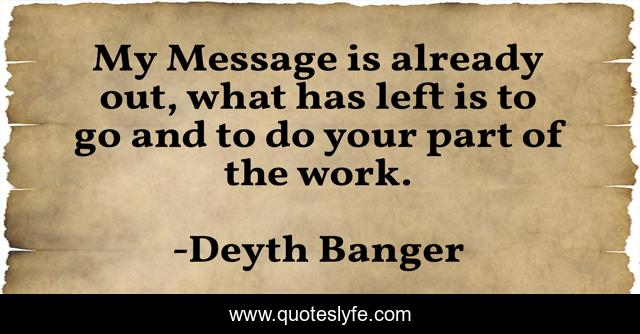 This page presents the quote "My Message is already out, what has left is to go and to do your part of the work.". Author of this quote is Deyth Banger. This quote is about already, work, left, message, has, out,.