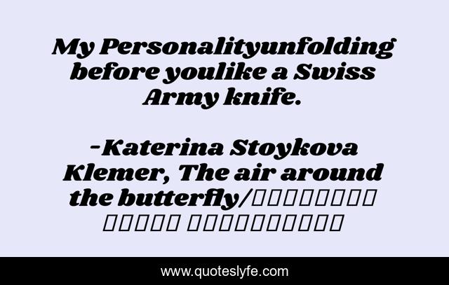 "Katerina Stoykova Klemer, The air around the butterfly/Въздухът около пеперудата Quotes." Quoteslyfe.com, 2025. Sat. 06 Dec. 2025. <https://www.quoteslyfe.com/quote/My-Personalityunfolding-before-youlike-a-Swiss-Army-24848>.