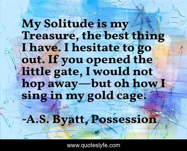 This page presents the quote "My Solitude is my Treasure, the best thing I have. I hesitate to go out. If you opened the little gate, I would not hop away—but oh how I sing in my gold cage.". Author of this quote is A.S. Byatt, Possession. This quote is about solitude, peace, introversion,.