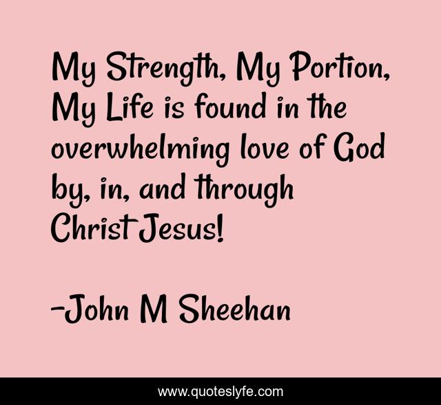 This page presents the quote "My Strength, My Portion, My Life is found in the overwhelming love of God by, in, and through Christ Jesus!". Author of this quote is John M Sheehan. This quote is about gods-grace, strength-and-courage, love-and-sayings, strength-through-adversity,.