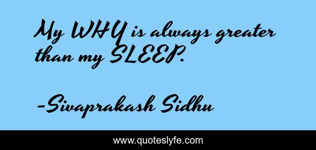 This page presents the quote "My WHY is always greater than my SLEEP.". Author of this quote is Sivaprakash Sidhu. This quote is about aggressive-behavior, sivaprakash-sidhu, sleep, goals-in-life, lesson-for-life,.