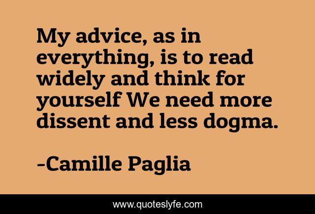 This page presents the quote "My advice, as in everything, is to read widely and think for yourself We need more dissent and less dogma.". Author of this quote is Camille Paglia. This quote is about autodidactism, dissent, reading, feminism,.