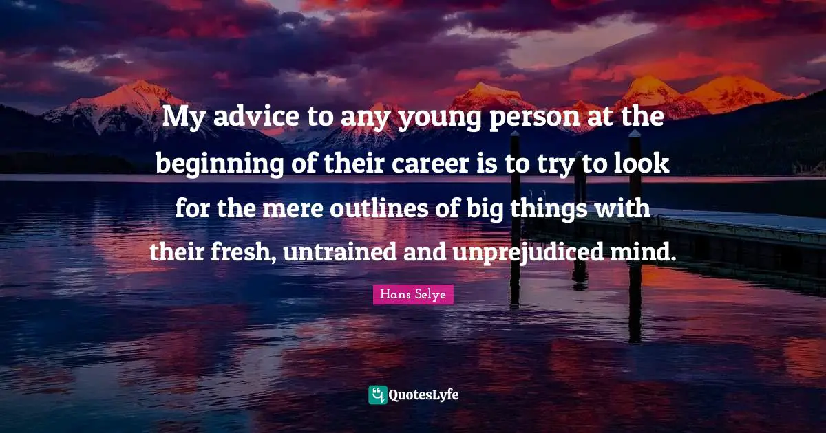 This page presents the quote "My advice to any young person at the beginning of their career is to try to look for the mere outlines of big things with their fresh, untrained and unprejudiced mind.". Author of this quote is Hans Selye. This quote is about advice, big things, mind, young, mere, outlines, careers,.