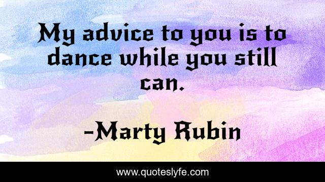 This page presents the quote "My advice to you is to dance while you still can.". Author of this quote is Marty Rubin. This quote is about dance, advice, seize-the-moment,.