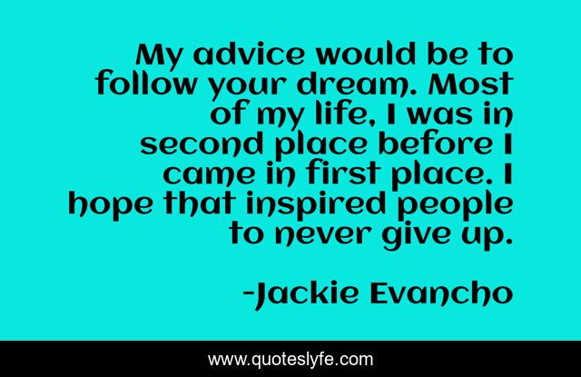 This page presents the quote "My advice would be to follow your dream. Most of my life, I was in second place before I came in first place. I hope that inspired people to never give up.". Author of this quote is Jackie Evancho. This quote is about advice, life, never give up,.