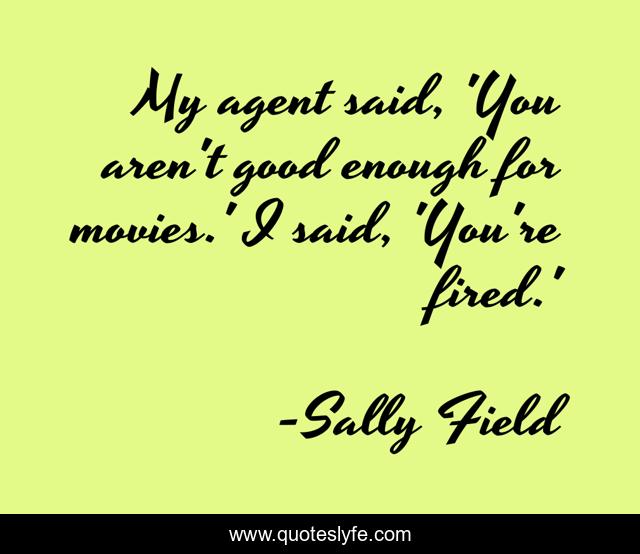 This page presents the quote "My agent said, 'You aren't good enough for movies.' I said, 'You're fired.'". Author of this quote is Sally Field. This quote is about good, said,.