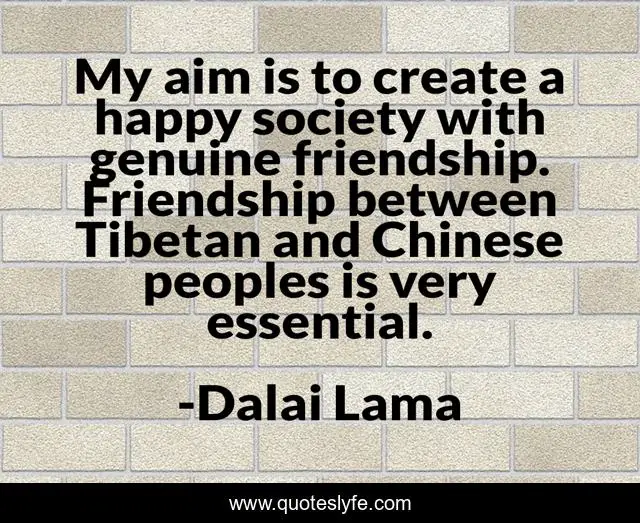 This page presents the quote "My aim is to create a happy society with genuine friendship. Friendship between Tibetan and Chinese peoples is very essential.". Author of this quote is Dalai Lama. This quote is about aim, society, happy,.