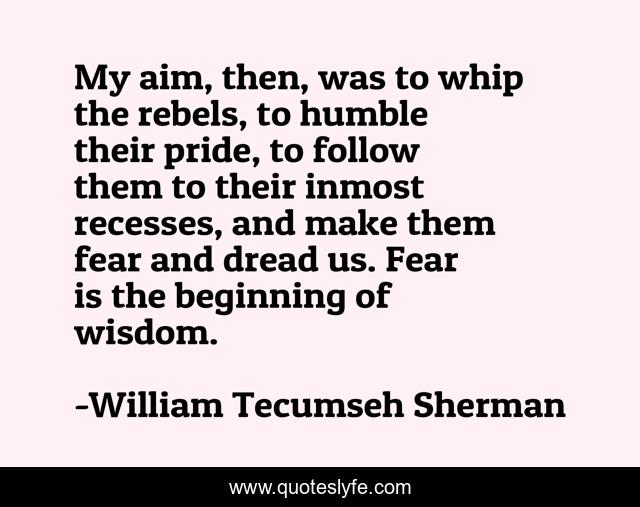 This page presents the quote "My aim, then, was to whip the rebels, to humble their pride, to follow them to their inmost recesses, and make them fear and dread us. Fear is the beginning of wisdom.". Author of this quote is William Tecumseh Sherman. This quote is about wisdom, pride, humble,.