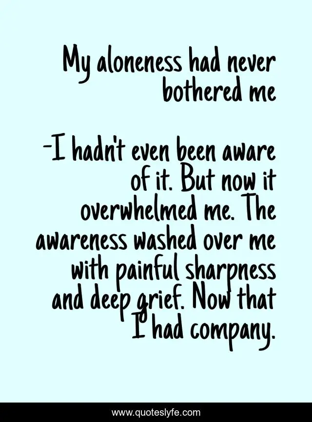 "I hadn't even been aware of it. But now it overwhelmed me. The awareness washed over me with painful sharpness and deep grief. Now that I had company. Quotes." Quoteslyfe.com, 2025. Fri. 05 Dec. 2025. <https://www.quoteslyfe.com/quote/My-aloneness-had-never-bothered-me-139309>.