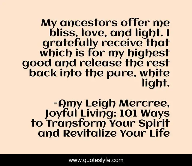 This page presents the quote "My ancestors offer me bliss, love, and light. I gratefully receive that which is for my highest good and release the rest back into the pure, white light.". Author of this quote is Amy Leigh Mercree, Joyful Living: 101 Ways to Transform Your Spirit and Revitalize Your Life. This quote is about highest-good, ancestors, amy-leigh-mercree, inspirational, quote-of-the-day, quote-about-life, life, joyful-living, quotes-de-la-vida,.