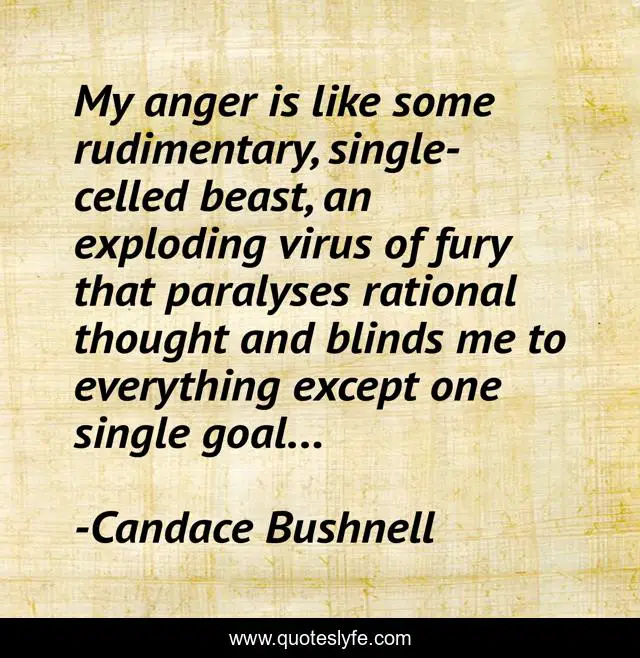 This page presents the quote "My anger is like some rudimentary, single-celled beast, an exploding virus of fury that paralyses rational thought and blinds me to everything except one single goal...". Author of this quote is Candace Bushnell. This quote is about anger, the-carrie-diaries,.