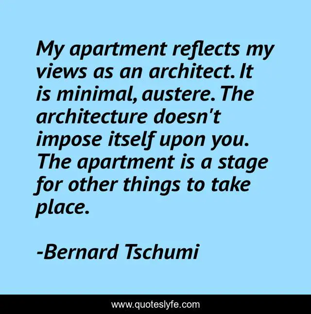 This page presents the quote "My apartment reflects my views as an architect. It is minimal, austere. The architecture doesn't impose itself upon you. The apartment is a stage for other things to take place.". Author of this quote is Bernard Tschumi. This quote is about apartment, place,.