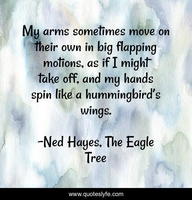 This page presents the quote "My arms sometimes move on their own in big flapping motions, as if I might take off, and my hands spin like a hummingbird’s wings.". Author of this quote is Ned Hayes, The Eagle Tree. This quote is about climate-change, autistic, autism, trees, eagletree,.
