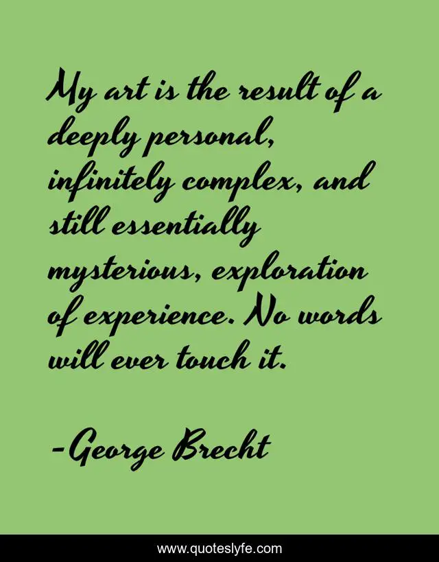 This page presents the quote "My art is the result of a deeply personal, infinitely complex, and still essentially mysterious, exploration of experience. No words will ever touch it.". Author of this quote is George Brecht. This quote is about personal, art,.