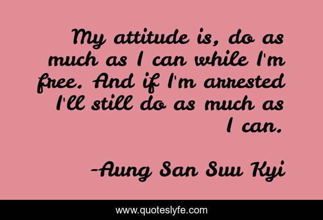 This page presents the quote "My attitude is, do as much as I can while I'm free. And if I'm arrested I'll still do as much as I can.". Author of this quote is Aung San Suu Kyi. This quote is about still, free, i can,.