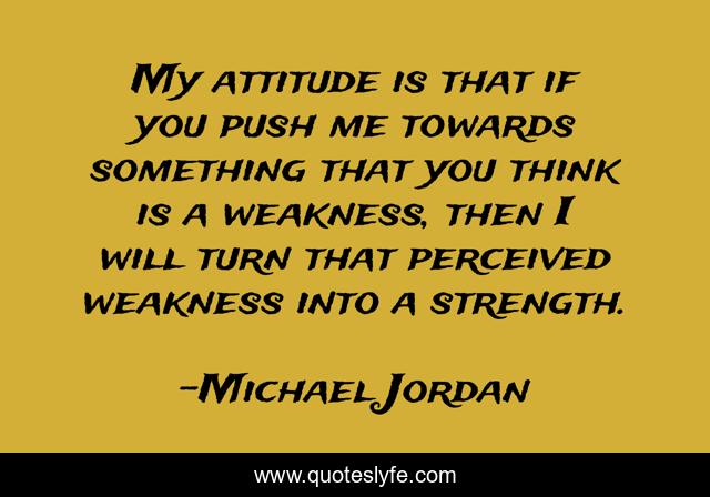 This page presents the quote "My attitude is that if you push me towards something that you think is a weakness, then I will turn that perceived weakness into a strength.". Author of this quote is Michael Jordan. This quote is about michael-jordan, weakness, strength,.