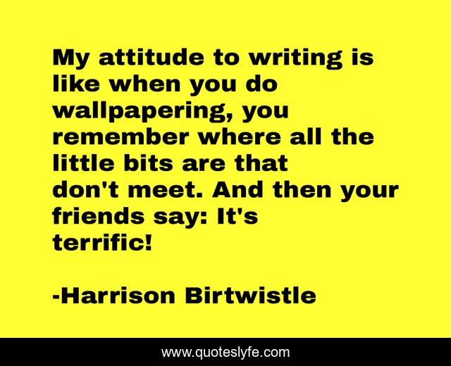 This page presents the quote "My attitude to writing is like when you do wallpapering, you remember where all the little bits are that don't meet. And then your friends say: It's terrific!". Author of this quote is Harrison Birtwistle. This quote is about friends, remember, writing,.