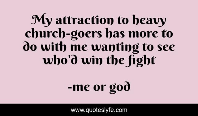 This page presents the quote "My attraction to heavy church-goers has more to do with me wanting to see who'd win the fight". Author of this quote is me or god. .