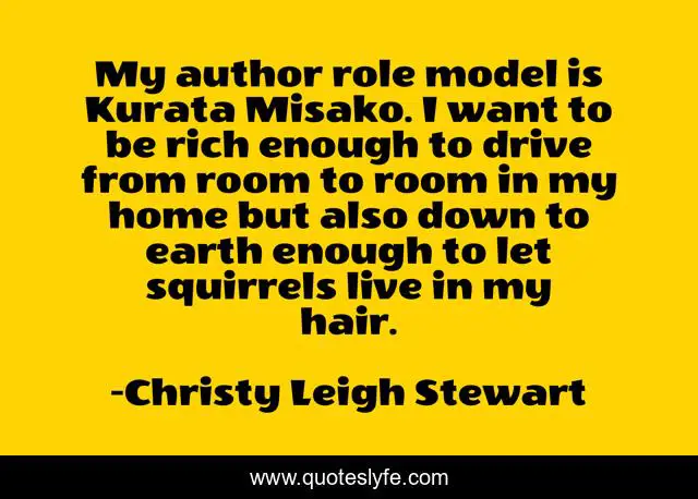 This page presents the quote "My author role model is Kurata Misako. I want to be rich enough to drive from room to room in my home but also down to earth enough to let squirrels live in my hair.". Author of this quote is Christy Leigh Stewart. This quote is about kurata-misako, role-models, squirrel, role-model, author,.