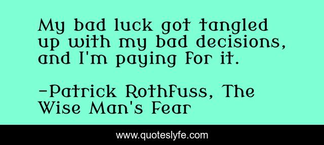 This page presents the quote "My bad luck got tangled up with my bad decisions, and I'm paying for it.". Author of this quote is Patrick Rothfuss, The Wise Man's Fear. This quote is about decisions, luck,.