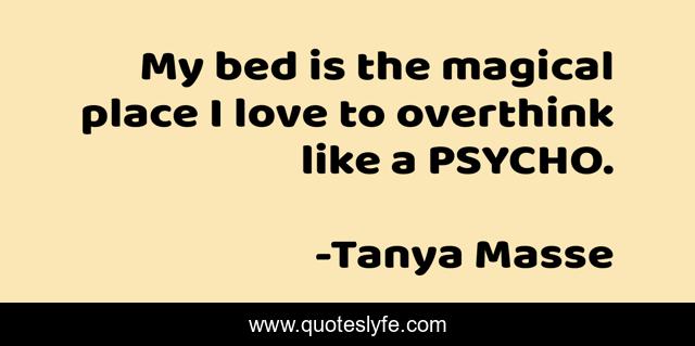 This page presents the quote "My bed is the magical place I love to overthink like a PSYCHO.". Author of this quote is Tanya Masse. This quote is about quotes-about-like, life, no-sleep, sleep, quotes-about-sleeping,.