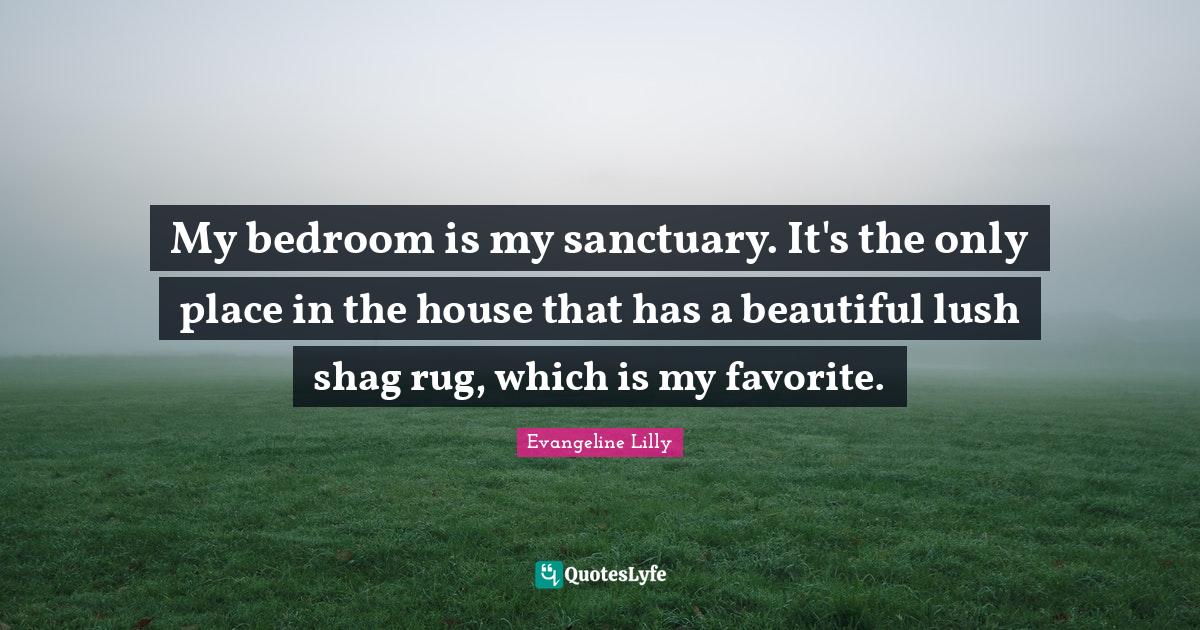 This page presents the quote "My bedroom is my sanctuary. It's the only place in the house that has a beautiful lush shag rug, which is my favorite.". Author of this quote is Evangeline Lilly. This quote is about lush, beautiful, house, sanctuary, bedroom, my favorite,.