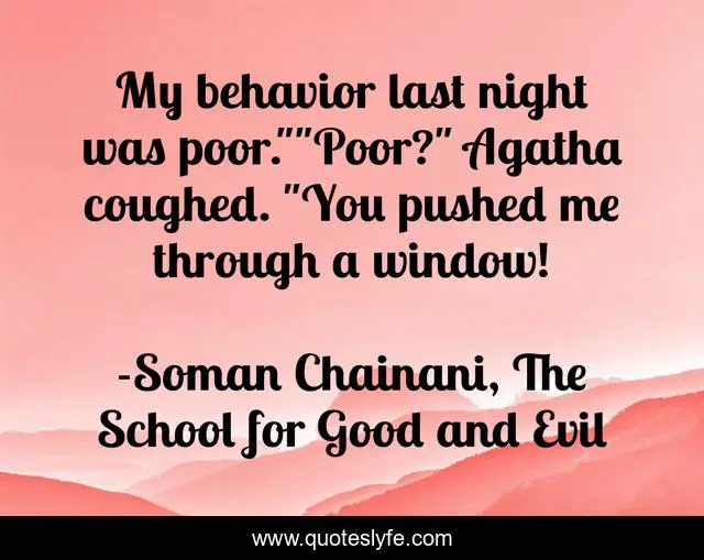 This page presents the quote "My behavior last night was poor.""Poor?" Agatha coughed. "You pushed me through a window!". Author of this quote is Soman Chainani, The School for Good and Evil. This quote is about poor, window, humor, behavior,.