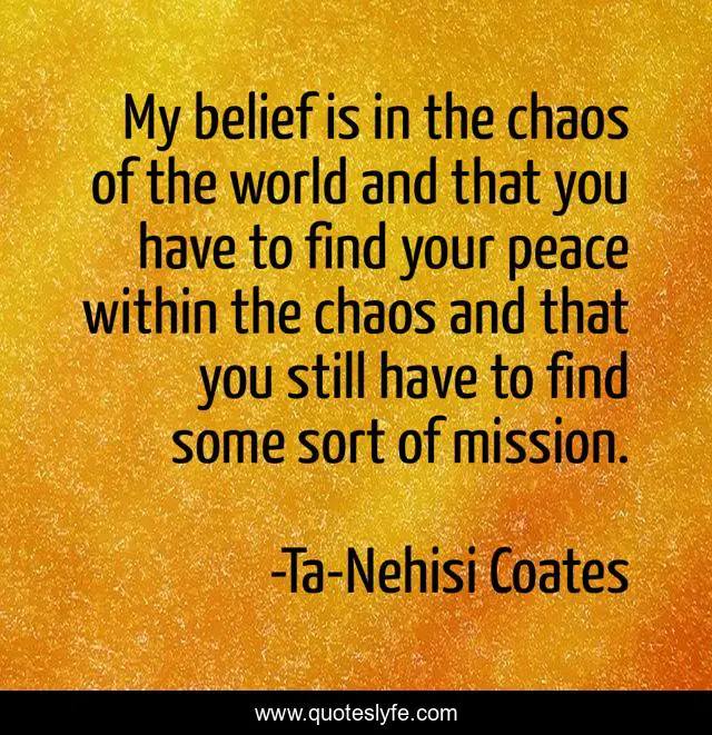 This page presents the quote "My belief is in the chaos of the world and that you have to find your peace within the chaos and that you still have to find some sort of mission.". Author of this quote is Ta-Nehisi Coates. This quote is about world, chaos, belief,.