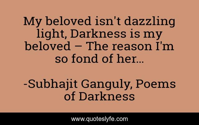 This page presents the quote "My beloved isn't dazzling light, Darkness is my beloved – The reason I'm so fond of her…". Author of this quote is Subhajit Ganguly, Poems of Darkness. This quote is about literature, darkness, light, fond, beloved, poems,.